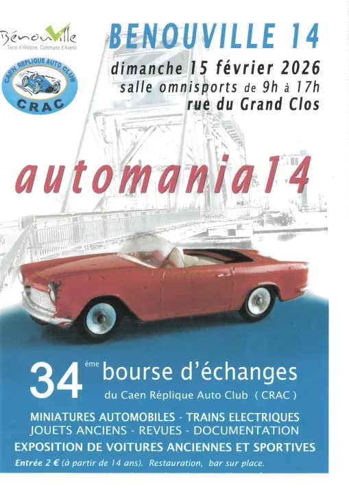 34ème bourse d’échanges véhicules miniatures Organisée par Caen Réplique Auto Club. Dimanche 15 février à la salle omnisports, de 9h à 17h. Entrée: 2€ – Bar et restauration sur place. https://crac-caen.blogspot.com/ 16/02/2020/par Sébastien Ducy https://www.mairie-benouville.fr/wp-content/uploads/2026/02/AUTOMANIA.webp 720 509 Sébastien Ducy https://www.mairie-benouville.fr/wp-content/uploads/2024/08/logo-benouville-092020-gris-340-156-300x138.webp Sébastien Ducy2026-02-05 10:18:482026-02-05 10:18:4834ème bourse d’échanges véhicules miniatures