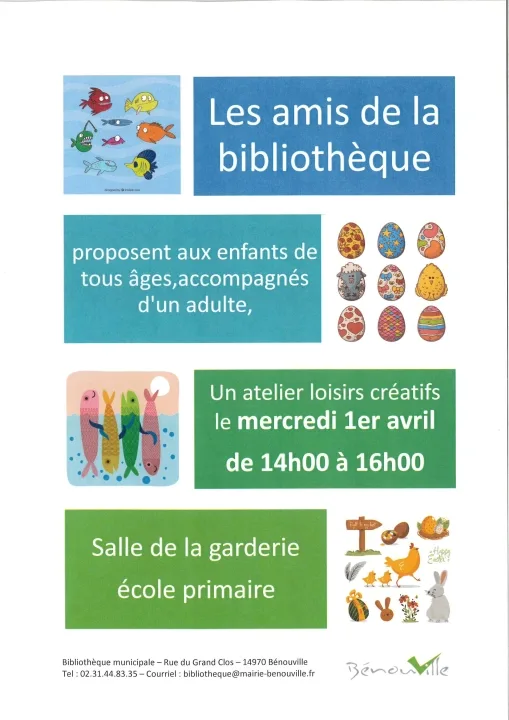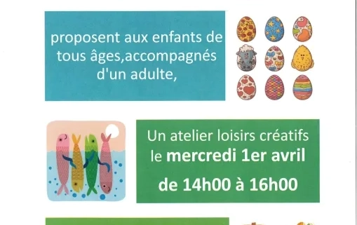 Les Amis de la Bibliothèque proposent aux enfants de tous âges, accompagnés d’un adulte, un atelier loisirs créatifs le mercredi 1er avril, de 14h00 à 16h00, dans la salle de garderie de l’école primaire.