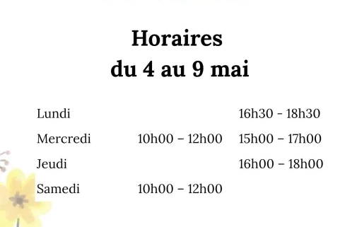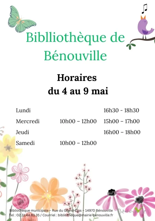 Bibliothèque – Info horaires Actualités, Actualités-accueil Du lundi 4 au samedi 9 mai, la bibliothèque ouvrira aux horaires suivants : Lundi 16h30 à 18h30, Mercredi 10h00 à 12h00 et 15h00 à 17h00, jeudi 16h00 à 18h00 samedi 10h00 à 12h00. 27 avril 2026/par Sébastien Ducy https://www.mairie-benouville.fr/wp-content/uploads/2026/04/4_au_9-mai.webp 720 505 Sébastien Ducy https://www.mairie-benouville.fr/wp-content/uploads/2024/08/logo-benouville-092020-gris-340-156-300x138.webp Sébastien Ducy2026-04-27 15:58:312026-04-27 15:58:31Bibliothèque – Info horaires