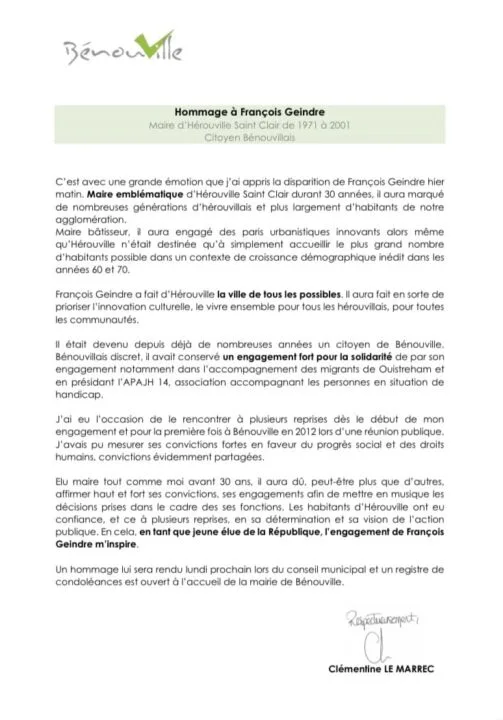 Pour les habitants, voisins et amis, un registre de condoléances est ouvert à l’accueil de la mairie.
