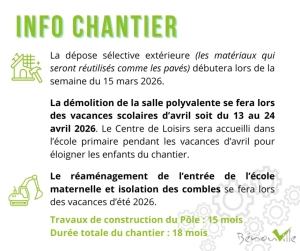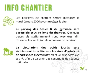 Infos chantiers salle polyvalente -école A la une, Actualités, Actualités-accueil Ci-dessous les informations concernant l’ouverture des chantiers salle polyvalente/école maternelle! 2 mars 2026/par Sébastien Ducy https://www.mairie-benouville.fr/wp-content/uploads/2024/10/Vue-de-la-Mairie.webp 403 1280 Sébastien Ducy https://www.mairie-benouville.fr/wp-content/uploads/2024/08/logo-benouville-092020-gris-340-156-300x138.webp Sébastien Ducy2026-03-02 15:28:562026-03-02 15:42:49Infos chantiers salle polyvalente -école