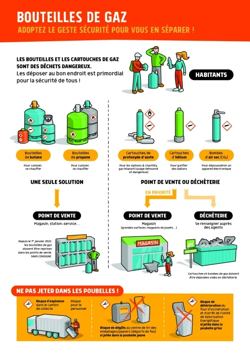 Pour la sécurité des personnes et des installations, il est donc strictement interdit de jeter les bouteilles et cartouches de gaz dans les poubelles grises et les poubelles jaunes.